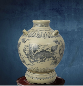 Bình được các nghệ nhân Chu Đậu lấy cảm hứng từ tích cổ: “Tứ lân ” chế tác thủ công họa tiết dưới men (men được chiết xuất từ tro trấu - dòng men đã được xác lập Kỷ lục độc bản Việt Nam) với bố cục chặt chẽ gồm ba phần: