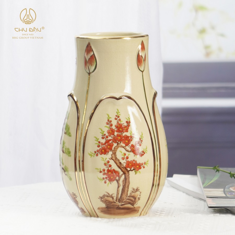 Bình hoa sen gốm Chu Đậu phiên bản vẽ vàng kim cao cấp, men màu