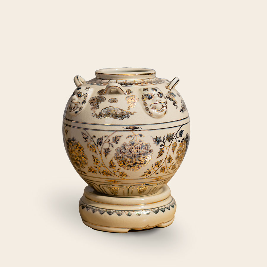 Phần cổ và vai bình được trang trí họa tiết cổ và đắp nổi bốn mặt hổ phù có tác dụng trấn bốn phương Đông – Tây – Nam – Bắc.