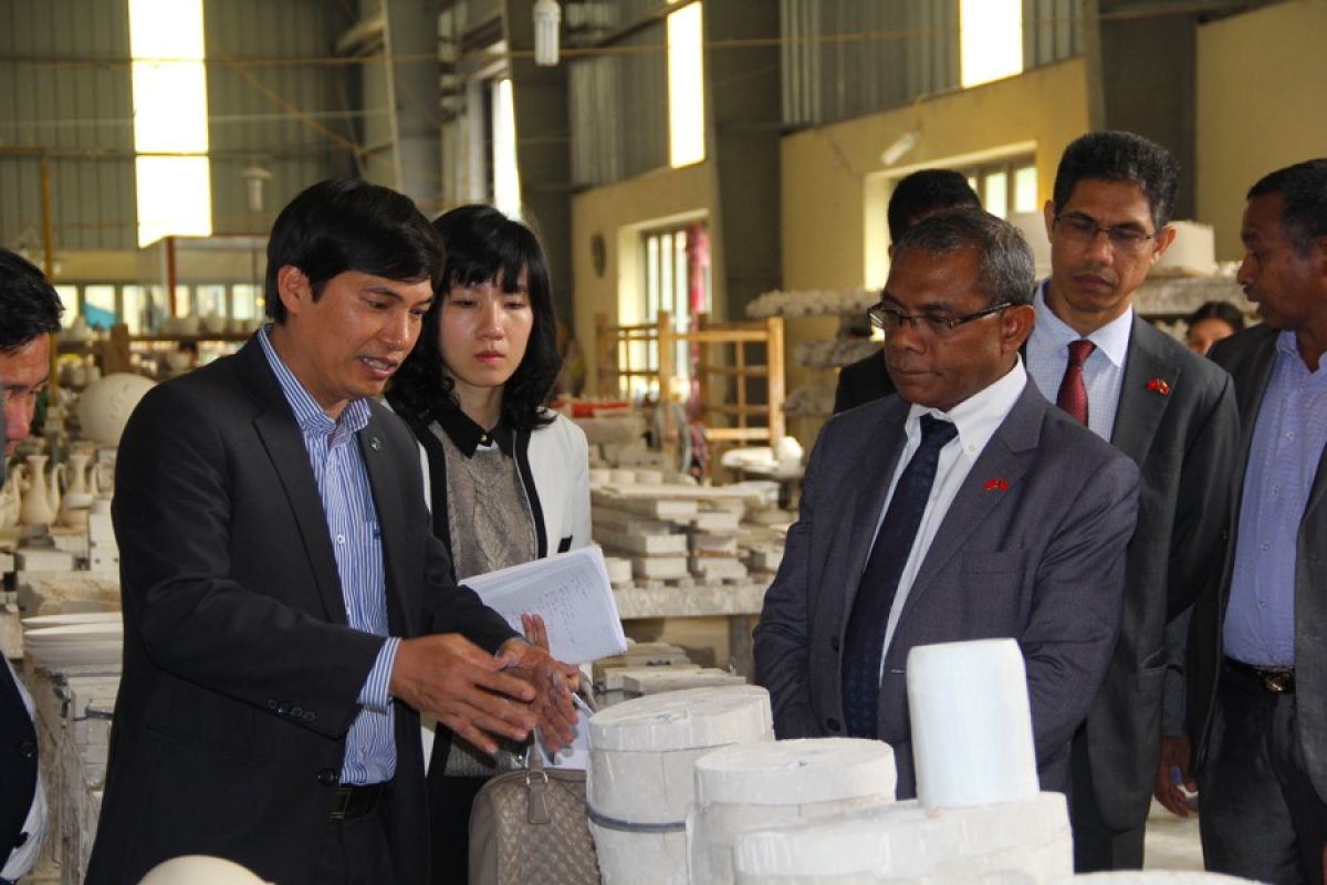 Giám đốc Công ty Cổ phần Gốm Chu Đậu đang giới thiệu quy trình sản xuất hàng cho ông Constancio Pinto - Bộ trưởng Bộ Thương mại, Công nghiệp và Môi trường nước Đông Timor